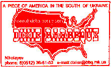 Dixi BBQ - Дикси Барбекью - ресторан/бар на пересечении Советской и проспекта Ленина. Когда-то был нехилый, пока хозяин был Стив Вингейт Пейдж. Было единственное место в городе, где почти каждый вечер играл "живьем" рок-н-ролл, FoxTrott и Крёстный Отец делали кавера. Есть небольшая сцена, барабанщик помещается в каморке за сценой. Звук не самый хреновый, танцы опять же. Дизайн под Южные Штаты - скальпы индейцев и янки, трубки мира, картины на тему "погоня на конях за беглым ниггером" :). Стив будучи трезвым по-русски говорить отказывался, зато пел с Текилой свои американские песни. Щас нет его - мафия выгнала. Музыка щас - спрлошняком Monte Carlo. Тел - (380-0512) 47-30-80, офис - 36-81-53. Есть мыльце - dixies@bbq.mk.ua. Существует страничка про Стива и Дикси - carey-europe.euro.ru/bussines.htm. |