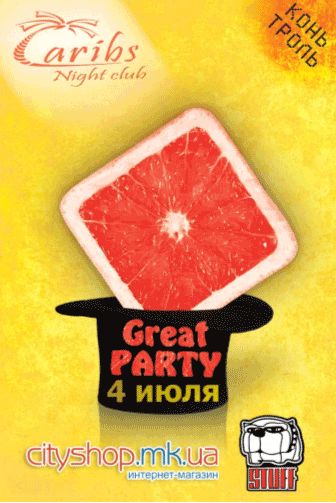 Группа GreatФрут, которую мы знаем по множеству концертов в городе, приглашает всех на клубный танцпол, проверить свое умение веселиться. Концерт-вечеринка «GreatParty» - это коктейль из выступлений живых коллективов, DJ'ских сетов, сюрпризов и современной шоу-программы.
