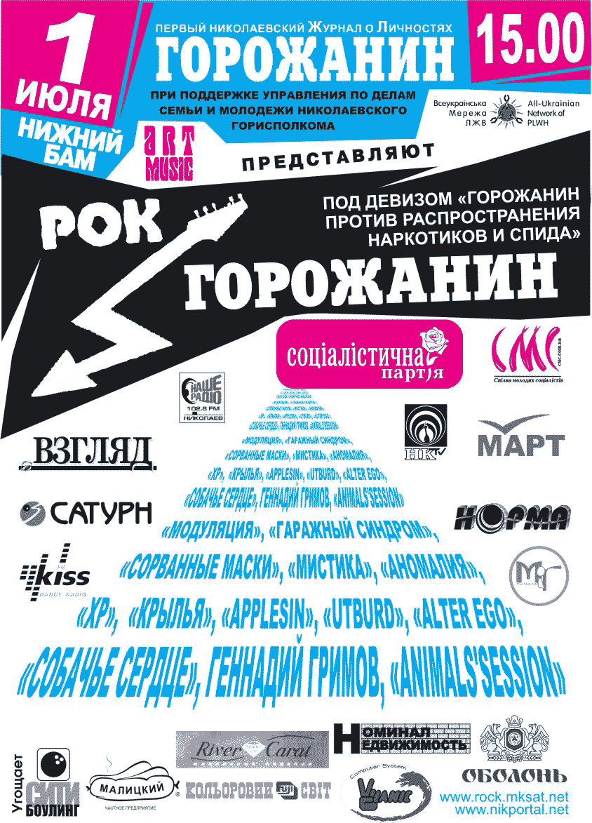 Сайт концерта - http://revolt.rock.mk.ua/ Обсудить в гесте ВПЕРВЫЕ В НИКОЛАЕВЕ!!! ![]() КОМПАНИЯ "АРТ-МЮЗИК" ПРИ ПОДДЕРЖКЕ НИКОЛАЕВСКОЙ МОЛОДЕЖНОЙ ОГРАНИЗАЦИИ "БАТЬКІВЩИНА МОЛОДА" ПРЕДСТАВЛЯЮТ: 28 СЕНТЯБРЯ - НИЖНЯЯ НАБЕРЕЖНАЯ БУЛЬВАРА АДМИРАЛА МАКАРОВА (НИЖНИЙ БАМ) - 16.00. IX ЕЖЕГОДНЫЙ МУЗЫКАЛЬНЫЙ ФЕСТИВАЛЬ "РОК-ЮГ 2007". ПРИ УЧАСТИИ НИКОЛАЕВСКИХ ГРУПП: а также ГОСТЕЙ ФЕСТИВАЛЯ - ГРУПП: ПОДДЕРЖКА - ТМ"Оболонь", альянс предприятий "Юг-Информ", агенство "Номинал-недвижимость", стоматология "Денсар" ГЕНЕРАЛЬНЫЙ МЕДИА-ПАРТНЕР - газета "ВЗГЛЯД" ![]() ЖУРНАЛ "ГОРОЖАНИН" и КОМПАНИЯ "АРТ-МЮЗИК" ПРИ ПОДДЕРЖКЕ УПРАВЛЕНИЯ ПО ДЕЛАМ СЕМЬИ И МОЛОДЕЖИ НИКОЛАЕВСКОГО ГОРИСПОЛКОМА и НИКОЛАЕВСКОГО ОТДЕЛЕНИЯ ВСЕУКРАИНСКОЙ БЛАГОТВОРИТЕЛЬНОЙ ОРГАНИЗАЦИИ "ВСЕУКРАИНСКАЯ СЕТЬ ЛЖВ" ПРЕДСТАВЛЯЮТ 1 ИЮЛЯ НА НИЖНЕМ БАМе 7-й фестиваль "РОК-ГОРОЖАНИН 2007" ПОД ДЕВИЗОМ "ГОРОЖАНИН ПРОТИВ РАСПРОСТРАНЕНИЯ НАРКОТИКОВ И СПИДА" ПАТРОНАТ - Социалистическая Партия Украины и Союз Молодых Социалистов ПОДДЕРЖКА - "Оболонь", "Виланик", "Номинал-Недвижимость", ювелирный центр "Диамант", "Кольоровий світ", ЧП Малицкий, "Сити-боулинг" УЧАСТНИКИ: