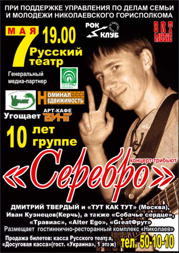 6 ноября в 22.35 на телеканале "Марс-ТВ" и 7 ноября в 16.00 на телеканале "Сатурн" (35 канал) состоится показ телевизионной версии фестиваля "Митьковские песни-2007" с участием Джазового оркестра Николаевского музыкального училища под управлением Михаила Полторака, вице-консула Генерального консульства Российской Федерации в Одессе Валерия Катункина, Олега Кошевого, Натальи Оконской, Андрея Паклина, группы "Alter Ego", Павла Коптева ("Собачье Сердце"), цыганского ансамбля "Бахталэ", Ирины Руденко, Татьяны Лавской, Анны Сидоренко, Ирины Слепчук-Кадышевой ("ДНК"), Никиты Худякова ("GreatФрут") и Александра Дубчука. CapeTown - НащоЮБИЛЕЙ ГРУППЫ «КРЕСТНЫЙ ОТЕЦ» ИЛИ МУЗЫКА, КОТОРАЯ ОБЪЕДИНЯЕТ 10 лет Рок-клубу: праздничный марафон ПОБЕДИТЕЛИ НИКОЛАЕВСКОЙ МУЗЫКАЛЬНОЙ ПРЕМИИ "ОБОЙМА ДЕСЯТИЛЕТИЯ": «ОТКРЫТИЕ ДЕСЯТИЛЕТИЯ»: «Animals’Session» «ЛУЧШЕЕ СРЕДСТВО МАССОВОЙ ИНФОРМАЦИИ»: Сайт www.rock.mksat.net «ЛУЧШИЙ АКУСТИЧЕСКИЙ ПРОЕКТ»: «Серебро» «ЛУЧШИЙ АЛЬБОМ»: «Под юбкой» - группа «Собачье сердце» «ЛУЧШИЙ КОНЦЕРТ»: Концерт Бориса Гребенщикова и группы «Аквариум» с программой «Стоп-машина» в Русском театре в рамках акции «Прорыв 2000» 11 апреля 2000 г. «ЛУЧШАЯ ПЕСНЯ»: «Хочу Пугачеву» - группа «Собачье сердце» «ЛУЧШИЕ ТЕКСТЫ»: Дмитрий Твердый («Серебро») «ЛУЧШИЙ БАРАБАНЩИК»: Евгений Бордан («Апрельские тезисы») «ЛУЧШИЙ КЛАВИШНИК»: Алексей Лаптев («Радиокефир», «Gorchitza») «ЛУЧШИЙ БАС-ГИТАРИСТ»: Николай Усатый («Animals’Session») «ЛУЧШИЙ ГИТАРИСТ»: Геннадий Гримов «ЛУЧШИЙ ВОКАЛИСТ»: Александра Макаровская («Animals’Session») «ЛУЧШАЯ ГРУППА»: «Серебро» Интервью с Евгением Маргулисом накануне 10-летия Николаевского городского рок-клуба. «ОБОЙМА ДЕСЯТИЛЕТИЯ» ИЛИ ЮБИЛЕЙ РОК-КЛУБА В ЛИЦАХ