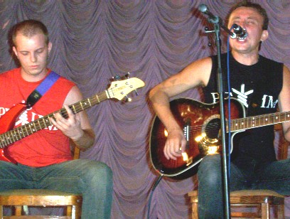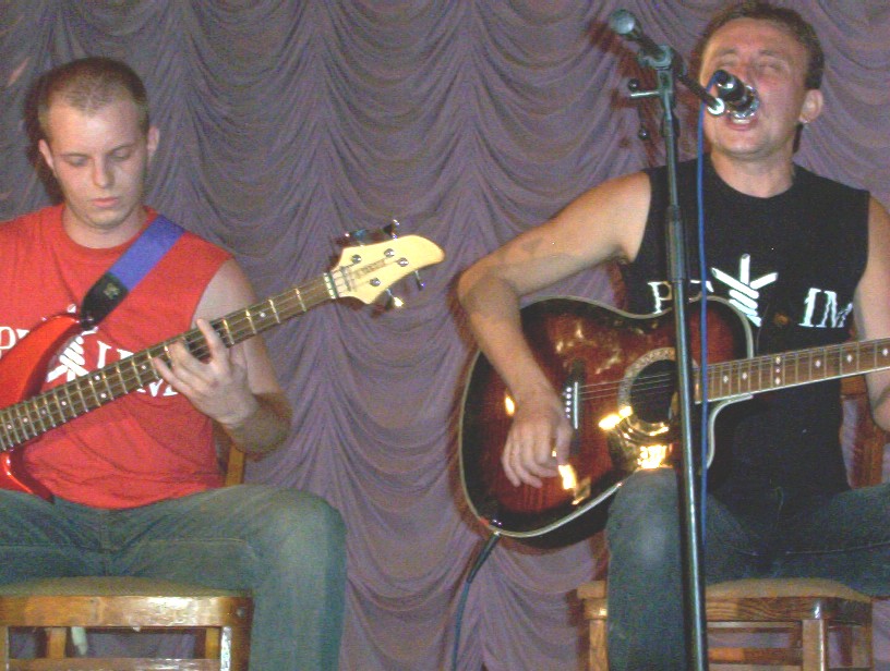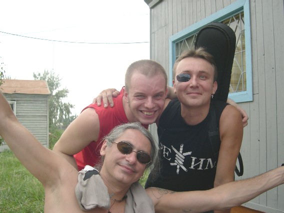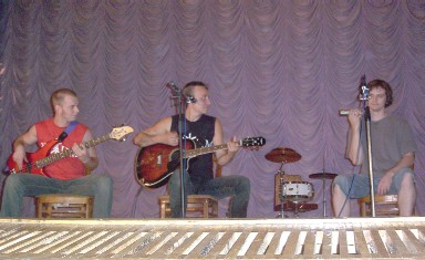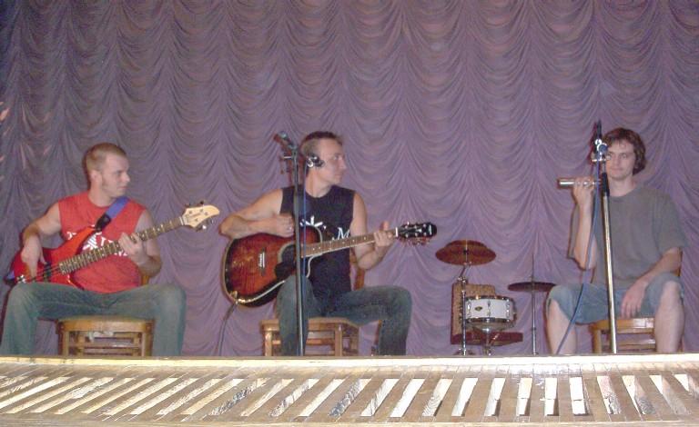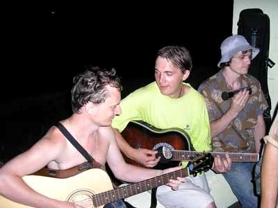 приближающийся ужин, наспех репетировали новую песню Касечки, которую она только что написала. Таким образом, мы явились последователями библейских волхвов, явившись на роды с пивным перегаром в качестве дара для новорожденной и анестезии для мамаши…. Короткие напутствия на грядущую трапезу и музыканты отправились набивать утробу… а мы остались наедине с пивными лотками…. Время шло, пиво лилось, ТУЧИ НАДВИГАЛИСЬ…. а вслед за ними и вопрос о судьбе концерта в случае дождя. Вскоре мы стали больше тревожиться не о судьбе концерта, а судьбе нашей одежды. Нет, дело было не в пиве, и даже не в безмерном количестве его потребления, а в начинающемся ливне. В связи с этим, обрушившимся на наши головы подарком природы, все слушатели и накушавшиеся музыканты, дружненько ринулись под козырёк забытого ранее всеми кафе… (хоть на что-то сгодилось)… а тучи всё сгущались, ливень усиливался… Вместе с водой на хмельные головы организаторов свалилась проблема в лице водителя автобуса, который он никак не мог сдвинуть с места… что делать? Аппаратуру, которую столь долго чекали и отстраивали, в мгновение ока накрыли клеёнкой и потихоньку перенесли под кров. Мало кто верил в то, что концерт состоится. И зря, концертов получилось аж два, или один в двух действиях…. Первый акт, решили немедля сыграть, прямо во время ливня, всё под тем же, на сей раз менее внушавшим доверие, козырьком, всё того же забытого всеми кафе (хоть на что-то сгодилось). Играли по инициативе музыкантов, организаторы исчезли с поля зрения сразу после начала дождя (судя по всему, решали дальнейшую судьбу феста).